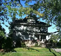 The home is a 2+1⁄2 story, American Foursquare style residential structure. Following standard Foursquare design, the house rests upon a squared, sandstone foundation and contains a basement. The Palmer House contains a large front porch with several broad pillars. Other features include bay windows, a hipped roof and dormers, and distended eaves.[3]
