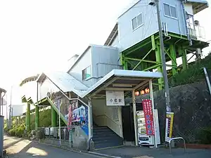 The station consists of a side platform serving a single track on an embankment. There is no station building but a shelter has been set up on the platform. From the main road, a roofed flight of steps leads up to the platform. A staffed ticket window is located at an intermediate landing halfway up the flight of steps.[3][4][5]