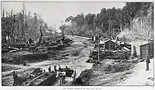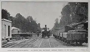 The Public Works Department transferred the station to NZ Railways on 9 November 1908,[1] though a road had been built in 1904,[3] by March 1905 a station yard was being formed[4] and by April 1906 it was the railhead, with a pumice road to Makatote. By then trains were bringing ballast,[5] platelaying was in progress[6] and the track stretched half way to Raurimu, having been realigned due to a slip and crossing an embankment into a 70 ft (21 m) cutting, which was being cut. An unnamed stream, then called the Waikohatu River, was to be bridged and pile-driving was in progress for a 276 ft (84 m) bridge over Piopiotea Stream, the bridge girders being made in Auckland by Fraser and Co.[7] The bridge has since been replaced in concrete.[8] By 10 May 1907 goods could reach Raurimu by rail.[4]