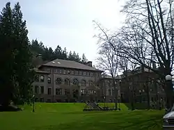 Governor John McGraw signed legislation establishing the New Whatcom Normal School on February 24, 1893, the first normal School in Western Washington. In November 1895, after enough funds were raised, construction began on a permanent school building on the Sehome Hill site by Fairhaven-based contractor W.B. Davey. Prominent Seattle architects Warren Skillings & James Corner were chosen to design the new building, a 4-story brick and stone building in the Italian Renaissance style.[2] The structure was largely completed by February 1897 but could not be opened to students until additional funds could be secured to install heating, lighting, and to do general grounds maintenance, which were not included in the original contract.[3] The first official class entered in 1899, composed of 88 students. Matching 4-story wings were added to the north and south ends of the building in 1907 under the direction of Bellingham architect Alfred Lee.[4]