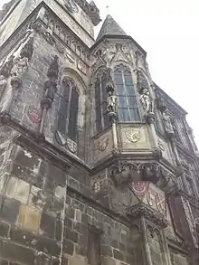The window on the left of the portal was completed a few years later and retained the architectural style. The builder eschewed the traditional Gothic arch in favour of a rectangular window, adorning the thickness of the walls with panelled pilasters. A moulded stone cross divides the window into four lights, the upper two of which are decorated with the armorial bearing of the Old Town of Prague and the Czech lion. Between and slightly above them are the symbol "W", representing the royal initial of the Bohemian king Vladislaus II of Hungary (1456–1516) of the Jagiellon dynasty. Rich stone vegetable decorations adorn the top of the window.