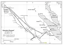 Operation Banquet was a British naval operation in the Second World War, commanded by Rear Admiral Clement Moody. The objective was to bomb Japanese positions in and around Padang, on the south-western coast of Sumatra in Indonesia, on 24 August 1944.[1] The primary targets of the attack, Padang airfield, the Indaroeng cement works, and the harbor facilities and shipping at Emmahaven were hit.[2][3]