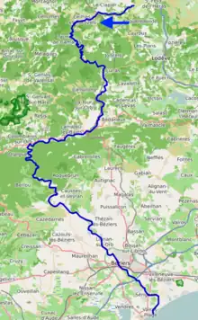 The Orb (French pronunciation: [ɔʁb]; Occitan: Òrb) is a 135.6-kilometre (84.3 mi) long river in the department of Hérault in the south of France.[1] It flows into the Mediterranean Sea at Valras-Plage. The river flows through the towns of Bédarieux and Béziers, where it is crossed by the canal du Midi on the Orb Aqueduct. In ancient times, the Orb was crossed at Capestang by the 1,500-metre (4,900 ft) long Roman Pont Serme.[2]