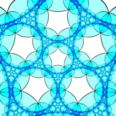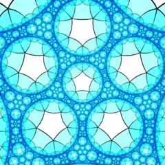In the geometry of hyperbolic 3-space, the infinite-order icosahedral honeycomb is a regular space-filling tessellation (or honeycomb) with Schläfli symbol {3,5,∞}. It has infinitely many icosahedra, {3,5}, around each edge. All vertices are ultra-ideal (existing beyond the ideal boundary) with infinitely many icosahedra existing around each vertex in an infinite-order triangular tiling vertex arrangement.