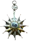 Class II It consists of a decoration of three monolithic surfaces, the first of the white port with the word Excellence written in black and surrounded by a star with twelve divisions in the colours of the flag of the Republic. The second and third surfaces of gold-plated copper metal as well as decorations from the yellow dial on the edges of the second surface. The medal hangs from a golden circle in the middle of which the emblem of the Democratic Republic of Sudan (Secretarybird or Rhinoceros) is drawn. The ribbon of this Class is similar to the scarf of Class II and wears the medal and the medal that follows it on the chest on the left.[1]