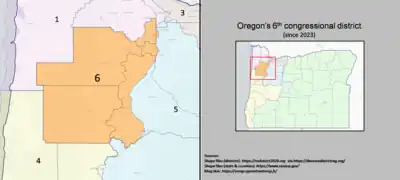 Oregon's 6th congressional district is a congressional district created after the 2020 United States census. It consists of Polk and Yamhill Counties, in addition to portions of Marion, Clackamas, and Washington Counties.[3] It takes in all of urban Salem, the state's capital, as well as the southwestern suburbs of Portland.
