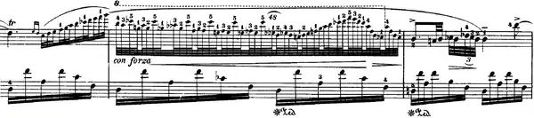 Whether the note should be played before or on the beat is largely a question of taste and performance practice. Exceptionally, the acciaccatura may be notated in the bar preceding the note to which it is attached, showing that it is to be played before the beat.[9] The implication also varies with the composer and the period. For example, Mozart's and Haydn's long appoggiaturas are – to the eye – indistinguishable from Mussorgsky's and Prokofiev's before-the-beat acciaccaturas.
