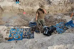 On 17 August 1992, an exhumation took place; Polish scientists of the Medical Academy from Lublin found 330 bodies, which were reburied on 30 August 1992, the 49th anniversary of the massacre, in a local cemetery. In 2003, a metal cross with a small chapel dedicated to Virgin Mary were erected here.[6]