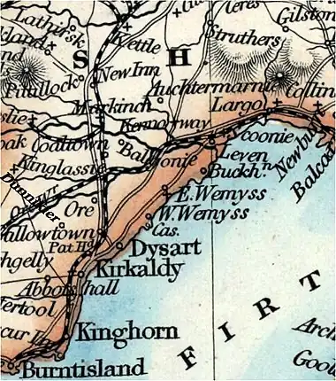 The first census of Scotland which included the recording of surnames at each address was that of 1841.[11] The latest published with names (due to confidentiality policy) is 1911. The occurrence of the Oswald surname at these two census shows that the name was distributed in the south of Fife, especially around Largo Bay from Kirkcaldy to Largo (see map).