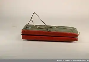 The otter may have multiple different designs. Otter boards used in bottom trawling are based on a similar principle of design. The design takes advantage of the shearing effect achieved when the board is positioned at an oblique angle to the current. The effect is reminiscent of that of a kite in the wind.[2][1] Different designs are found in Switzerland, the nordic countries, California and Japan. Most commonly the traditional board was made by wood, and had a length about two feet, a width of 6 inches and less than an inch thick. To enable it to float in an upright position it was equipped with metal weights made of lead or iron.[3] The correct amount of weights allows the board to float with only an inch or two above the surface. Snells, bated with flies or spoons are placed at intervals along the line. The snells would have different lengths due to the height above the water of the line along its length. An inch adjacent to the board and hip height adjacent to the fisherman. the longest snell would have been closest to the fisherman and the shortest closest to the board.[3] In Britain fishing with an otter was forbidden by the Salmon Fishery Act 1861, and this may have been one of the reasons why British anglers introduced it to Norway. The first ban on the device in Norway was imposed in 1870 an it was increasingly forbidden throughout the end of the century.[3]
