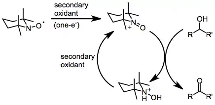 Nitroxide-catalyzed oxidations involve N-oxoammonium intermediates as the active oxidizing agent. The mechanism of oxidation of the nitroxide radical depends on the terminal oxidant employed. Two-electron oxidants, such as NaOCl, are able to directly convert nitroxides into oxoammoniums.