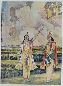 Krishna (left) wearing yellow garments, with Arjuna (right).