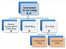 Since 1996, the college is commanded by an Air Vice Marshal. Under the Commandant is a Deputy Commandant/Chief Instructor War Wing, which are both Air Commodores. The Officer Commanding the Junior Command & Staff School is a Group Captain, who has a Chief Instructor Basic Staff Wing and Chief Instructor Junior Staff Wing under him.