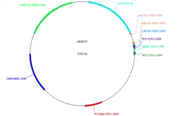 PBAD (systematically araBp) is a promoter found in bacteria and especially as part of plasmids used in laboratory studies. The promoter is a part of the arabinose operon whose name derives from the genes it regulates transcription of: araB, araA, and araD.[1][2] In E. coli, the PBAD promoter is adjacent to the PC promoter (systematically araCp), which transcribes the araC gene in the opposite direction. araC encodes the AraC protein, which regulates activity of both the PBAD and PC promoters.[3][4][5] The cyclic AMP receptor protein CAP binds between the PBAD and PC promoters, stimulating transcription of both when bound by cAMP.[6]