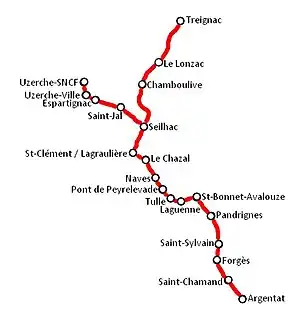 - From Seillac, a branch headed east to Treignac.