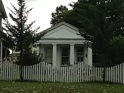 Paine's Bank is a small, white, single story, frame Greek Revival building. It has a pedimented tetrastyle Greek Doric portico with fluted columns and antae at the corners of the building.[2]
