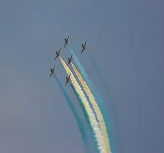 The Sherdils from the Pakistan Air Force Academy at Risalpur take part in the ceremony annually, performing formation aerobatics. On the planes used by the group, the Hongdu JL-8, has been showcased at the parade since 1994.