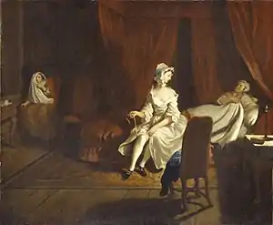 The book was already a popular one for painters - the younger artist Francis Hayman had produced designs for Gravelot's engravings for the 1742 edition[1] as well as a pair of scenes from the novel for Vauxhall Gardens, also around 1742[2] (one is lost and the other is now in the National Trust's collections at Sizergh Castle[3]). Highmore painted his series of twelve works between 1741 and 1743 and on 16 February 1744 advertised that ten of them were ready to be viewed at his studio, with another advertisement on 10 May announcing that all twelve paintings in the set were complete. The first advertisement also stated he was taking subscriptions for a set of twelve engravings after the novel[4] — Highmore had Louis Truchy and Antoine Benoist produce them.[5][6]