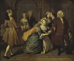 The series bears comparison with William Hogarth's contemporary series such as Marriage A-la-Mode, A Rake's Progress and A Harlot's Progress, also painted for the print market, but it differs from them in that they derive from a concrete literary source rather than the artist's plot-lines. Art historians see the Pamela series as placing Highmore alongside Hogarth and Hayman as "one of the initiators of a British school of narrative painting".[7] Though Highmore's paintings were intended as treatments of scenes from the novel rather than strictly as illustrations, Highmore and Richardson became close friends, with the former painting the latter's portrait as well as a scene from his later novel Clarissa.