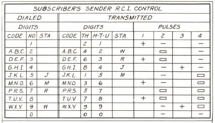 Also, when the panel office was designed, many people used party lines. Party line numbers were listed with a J, M, R, or W following the line number. The caller dialed the office code, the line number, and the digit corresponding to the letter. Party letters replace the ten-thousands digit described above. That is, PCI sends the letter followed by the four-digit line number. So party letters and line numbers above 10,000 can't be used together.