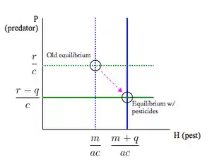 As one can see from the new isoclines, the new equilibrium will have a higher H value and a lower P value so the number of prey will increase while the number of predator decreases. Thus, prey, which is normally the targeted by the pesticide, is actually being benefited instead of harmed by the pesticide.