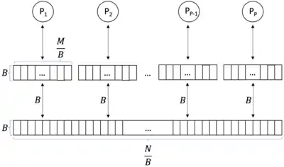 The PEM model[1] is a combination of the EM model and the PRAM model. The PEM model is a computation model which consists of processors and a two-level memory hierarchy. This memory hierarchy consists of a large external memory (main memory) of size and small internal memories (caches). The processors share the main memory. Each cache is exclusive to a single processor. A processor can't access another’s cache. The caches have a size which is partitioned in blocks of size . The processors can only perform operations on data which are in their cache. The data can be transferred between the main memory and the cache in blocks of size .
