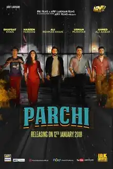 Parchi (Urdu: پرچی, transl. Chit) is a 2018 Pakistani Urdu-language crime comedy film directed by Azfar Jafri and produced by Imran Kazmi and Arif Lakhani under the banner IRK Films.[3] The film stars Hareem Farooq, Ali Rehman Khan and Shafqat Cheema,[4] with Ahmed Ali Akbar, Faiza Saleem, Shafqat Khan and Usman Mukhtar in supporting roles. Khan also wrote film whilst Usman Mukhtar managed cinematography; Farooq also produced the film.[5] It was released and distributed by ARY Films on 5 January 2018.