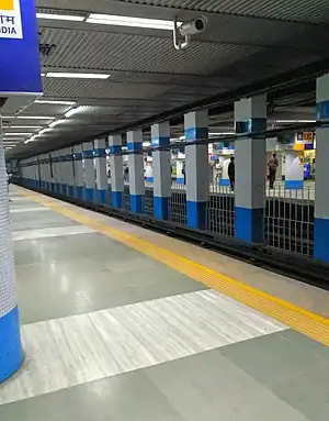 Park Street (otherwise known as IIHM Park Street for sponsorship reason) is an underground interchange metro station on the North-South corridor of the Blue Line and on the Purple Line of Kolkata Metro in Kolkata, West Bengal, India.[3][4][5] The station is located on the crossing of Jawaharlal Nehru Road and Mother Teresa Sarani (previously called Park Street after which the station was named). It is one of the deepest underground metro stations of Kolkata Metro. It is the only underground station to have side platforms, which are mostly seen in elevated metro stations.
