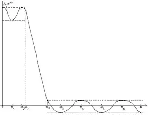 The picture above on the right displays the various extremal frequencies for the plot shown. The extremal frequencies are the maximum and minimum points in the stop and pass bands. The stop band ripple is the lower portion of ripples on the bottom right of the plot and the pass band ripple is the upper portion of the ripples on the top left of the plot. The dashed lines going across the plot indicate the δ or maximum error. Given the positions of the extremal frequencies, there is a formula for the optimum δ or optimum error. Since we do not know the optimum δ or the exact positions of the extrema on the first attempt, we iterate. Effectively, we assume the positions of the extrema initially, and calculate δ. We then re-estimate and move the extrema and recalculate δ, or the error. We repeat this process until δ stops changing. The algorithm will cause the δ error to converge, generally within ten to twelve iterations.[3]