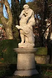 The Rosaleda (rose garden) is an early 20th century feature inspired by the Bagatelle rose garden in the Bois de Boulogne. Near the roses stands the Fountain of the Fallen Angel, erected in 1922, whose main sculpture El Angel Caído (at the top) is a work by Ricardo Bellver (1845–1924) inspired by a passage from John Milton's Paradise Lost,[5] which represents Lucifer falling from Heaven. It is claimed that this statue is the only known public monument of Satan.[6]