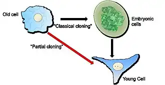 In the field of cell biology, the method of partial cloning (PCL) converts a fully differentiated old somatic cell into a partially reprogrammed young cell that retains all the specialised functions of the differentiated old cell but is simply younger.[1] The method of PCL reverses characteristics associated with old cells. For example, old, senescent, cells rejuvenated by PCL are free of highly condensed senescence-associated heterochromatin foci (SAHF) and re-acquire the proliferation potential of young cells.[2] The method of PCL thus rejuvenates old cells without de-differentiation and passage through an embryonic, pluripotent, stage.