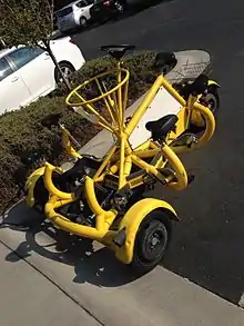 A party bike was invented in 1997 by Het Fietscafe BV from the Netherlands.[2] A party bike is sometimes mistaken for a larger-scale version of a pedicab (cycle rickshaw), but it is not, since the party bike is powered by the passengers, while the steering and braking is controlled by a driver who does not provide pedaling power. Some also double as rolling refreshment stands.[3][4] Party bikes are often used for staff parties and bachelor or bachelorette parties. They are often available at tourist attractions where they are rented by the hour or day.[3] When used in conjunction with alcohol, a party bike usually is hired with a driver.