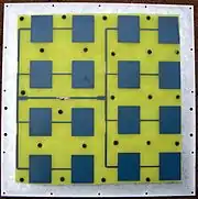 The two metal sheets together form a resonant piece of microstrip transmission line with a length of approximately one-half wavelength of the radio waves. The radiation mechanism arises from fringing fields along the radiating edges.[2] The radiation at the edges causes the antenna to act slightly larger electrically than its physical dimensions, so in order for the antenna to be resonant, a length of microstrip transmission line slightly shorter than one-half the wavelength at the frequency is used. The patch antenna is mainly practical at microwave frequencies, at which wavelengths are short enough that the patches are conveniently small. It is widely used in portable wireless devices because of the ease of fabricating it on printed circuit boards. Multiple patch antennas on the same substrate (see image) called microstrip antennas, can be used to make high gain array antennas, and phased arrays in which the beam can be electronically steered.