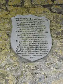 ![]() Plaque in Thurles commemorating Dwyer. It claims he "represented Ireland" at the 1928 Olympics; he did not fight but was present as a coach.[1] | |