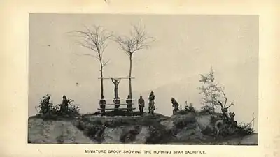 The Morning Star ceremony was a religious ceremony occasionally involving a ritual human sacrifice of a young girl, performed only by a single village (Village Across a Hill)[1]: 32 of the Skidi band of the Pawnee. It was connected to the Pawnee creation narrative, in which the mating of the male Morning Star with the female Evening Star created the first human being, a girl.