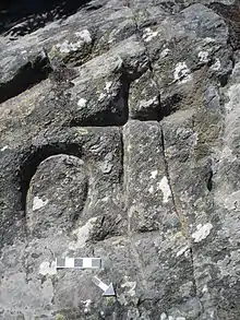 The engravings were firstly ascribed to Middle Ages when former studies were carried out during the 1980s. But recent studies show that no medieval materials are associated with the site, that is the reason to consider the set of engravings as a piece of art from the late prehistoric periods, popularly known as petroglyphs (engravings made on stones). The panel of Peñas de la Cerca is known since the 80's and it formed by three elements: A horseshoe, a double cross and a stick, 2008 campaign discovered that the panel was bigger than what was supposed in the 80's and two more symbols were discovered down the three we knew. A second horseshoe and another cross-like symbol. Techniques of engraving are also different the three at the top were made by friction but the two new ones were made with a burin or graver. Probably the new discoveries belong to a more modern copy or reinterpretation of the images and symbols at the top of the panel, visibly more ancient.