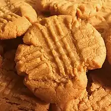 A peanut butter cookie is a type of cookie that is distinguished for having peanut butter as a principal ingredient. The cookie originated in the United States, its development dating back to the 1910s.