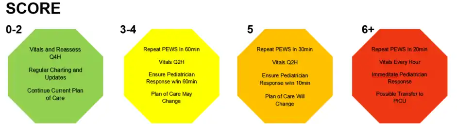 6+: There are severe consequences if quick intervention is not established, including possible permanent damage or death. A child with a PEWS score of 6+ will mostly be transferred to a PICU to receive the level of critical care they need to improve outcomes with a staff trained to do so.