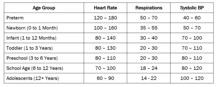Table containing the normal vital parameters of pediatric patients by age group.