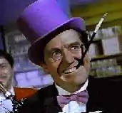 Penguin appears in Batman (1966), portrayed by Burgess Meredith. This version possesses a signature "quacking" laugh, which covered a cough caused by cigarette usage.[2] In the series, The Penguin is identified exclusively as "Mr. Penguin" (or occasionally "Mr. P. N. Guinn", which he uses as an alias).