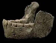 The Peninj Mandible(Peninj 1), also called Natron mandible,[1] is the fossilized lower jaw and teeth of an australopithecine specimen, likely that of Australopithecus boisei[2] or a similar population.[3] It was discovered in West Lake Natron,[4] in Ngorongoro District of Arusha Region of Tanzania by Kamoya Kimeu,[5][6] Glynn Isaac, and Richard Leakey in 1964.[7]
