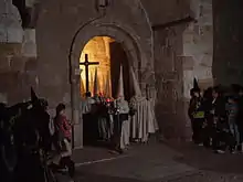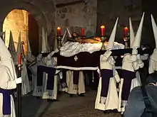 The procession starts at 11 pm Holy Thursday and is inspired by the burial of a poor man in a Zamora's village:[2] Jesus' body is covered with a shroud and is led to the grave in a simple stretcher, accompanied by its neighbors in complete silence, broken only by the bells of the viaticum and the slight tapping of the torches on the ground.[3]