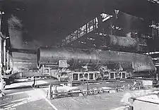 The S1 under construction at Altoona. The smaller boiler in the photo is for a B6 switcher giving a sense of scale.