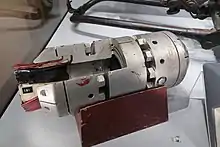 The Harvey flamethrower was introduced in August 1940, and was mostly made from readily available parts such as wheels from agricultural equipment manufacturers and commercially available compressed air cylinders.[95] It comprised a welded-steel cylinder containing 22 gallons (100 L) of creosote and a standard bottle of compressed nitrogen at 1,800 pounds per square inch (120 bar) mounted on a sack truck of the type that a railway-station porter might use. About 25 ft (7.6 m) of armoured hose provided the connection to a four-foot-long (1.2 m) lance with a nozzle and some paraffin-soaked cotton waste that was set alight to provide a source of ignition. In operation, the pressure in the fuel container was raised to about 100 psi (6.9 bar), causing a cork in the nozzle to be ejected followed by a jet of fuel lasting about 10 seconds at a range up to 60 ft (18 m).[96] Like the Home Guard flamethrower, it was intended as an ambush weapon, but in this case the operator was able to direct the flames by moving the lance which would be pushed through a hole in otherwise bulletproof cover such as a brick wall.[97][95][98][99]