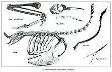 Skeleton of a female, showing the spur on the wing, pneumatization of the base of upper mandible, and trunk with sternum, trachea and hyoid