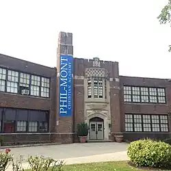 Philadelphia-Montgomery Christian Academy, commonly known as Phil-Mont Christian Academy, is a selective private Christian school serving grades PK-12.[2] Phil-Mont was founded in 1943 by Cornelius Van Til and others.[3] Phil-Mont's curriculum is rooted in a christian worldview, the principles of the liberal arts, and uses some features of a classical education model. Phil-Mont currently resides in the former Springfield Township High School & Hillcrest Junior High School building, built in 1923/24. Phil-Mont purchased the unused building and restored it to working order for grades 6-12 in 1979. The property was originally part of Chestnut Hill Park/White City Amusement Park, part of which is now also Springfield Township's James A. Cisco Park and Hillcrest Pond.