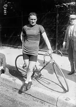 In 1914, he took his first stage victory, to Le Havre, holding the race from start to finish despite a 30-minute penalty for an unauthorised wheel change on the penultimate stage. His victory looked uncertain, his lead cut to less than two minutes ahead of Henri Pélissier.[4] Ironically, on the final stage from Dunkirk to Paris, the Frenchman's supporters along the route who were expecting victory over the Belgian were the reason he was prevented from launching a breakaway. He won the stage but Thys finished on his wheel to win the Tour.