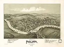 Philippi ('FILL-uh-pea') is a city in and the county seat of Barbour County, West Virginia, United States, along the Tygart Valley River.[5] The population was 2,929 at the 2020 census.[2] In 1861, the city was the site of the Battle of Philippi, known as the "Philippi Races". Although a minor skirmish, this is considered the earliest notable land action of the American Civil War. It is also known as the home of Alderson Broaddus University, a college affiliated with the American Baptist Churches. The city has a weekly newspaper, The Barbour Democrat.
