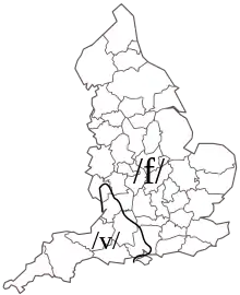 Initial fricative voicing is a process that occurs in some traditional accents of the English West Country, where the fricatives /f/, /θ/, /s/ and /ʃ/ are voiced to [v], [ð], [z] and [ʒ] when they occur at the beginning of a word. (Words beginning /θr/, like three, develop /dr/ instead.) In these accents, sing and farm are pronounced [zɪŋ] and [vɑːɻm]. The phenomenon is well known as a stereotypical feature, but is now rare in actual speech.[7] Some such pronunciations have spread from these dialects to become standard usage: the words vane, vat and vixen all had initial /f/ in Old English (fana, fæt, fyxen).[8]