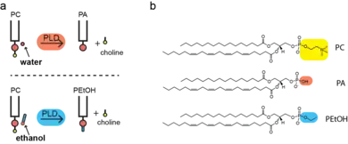 PEth synthesis by PLD; a) cartoon comparing PLD transphosphatidylation with water (top/red) to ethanol (bottom blue). b) chemical structures of substrate phosphatidylcholine (PC) and products phosphatidic acid (PA) and phosphatidylethanol (PEth)